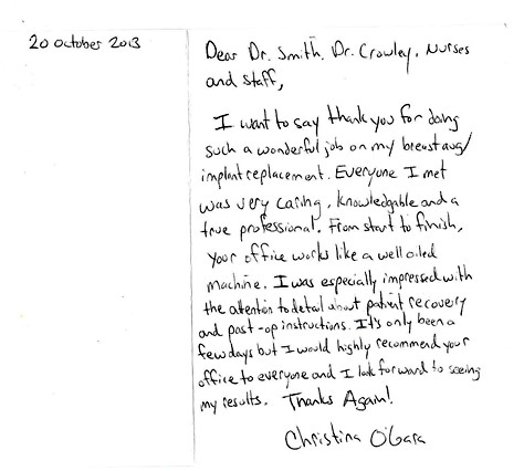 Oct 23, 2013 A Patient Thank You Card for Plastic Surgeon, Dr. Lane Smith Posted By Smith Plastic Surgery Categories Testimonials Previous Next